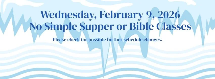 Wednesday evenings join us for Bible Study at 7:00. Come early for “Simple Supper” ($3 donation) at 6:00 pm. Not meeting 12/24 or 12/31/25